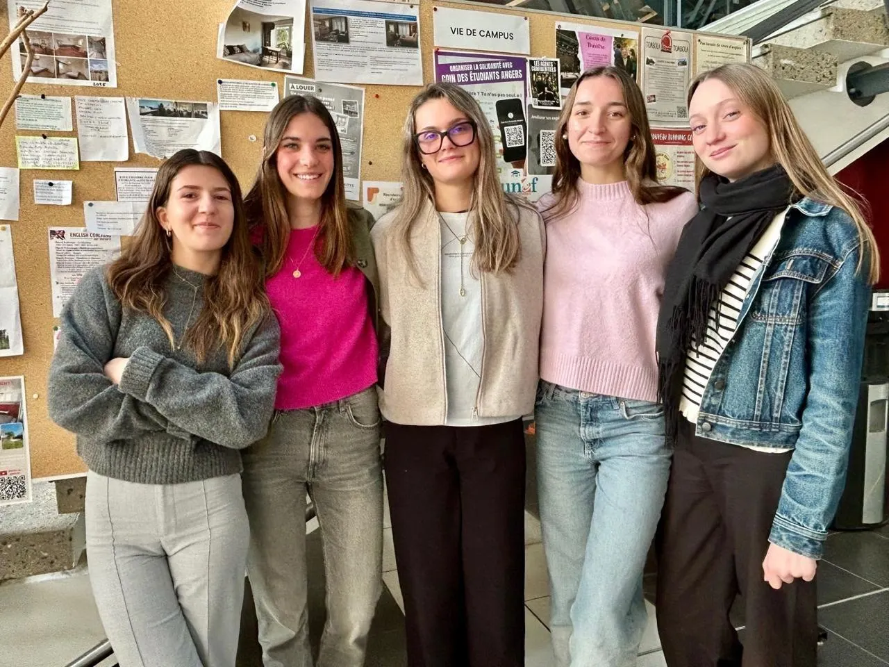 Angers, campus Saint-Serge, le 2 mars 2026. Parmi neuf étudiants et étudiantes rencontrées sur le campus, seule l’Angevine Céleste (2e à gauche), connaissait le nom du maire d’Angers. © CO