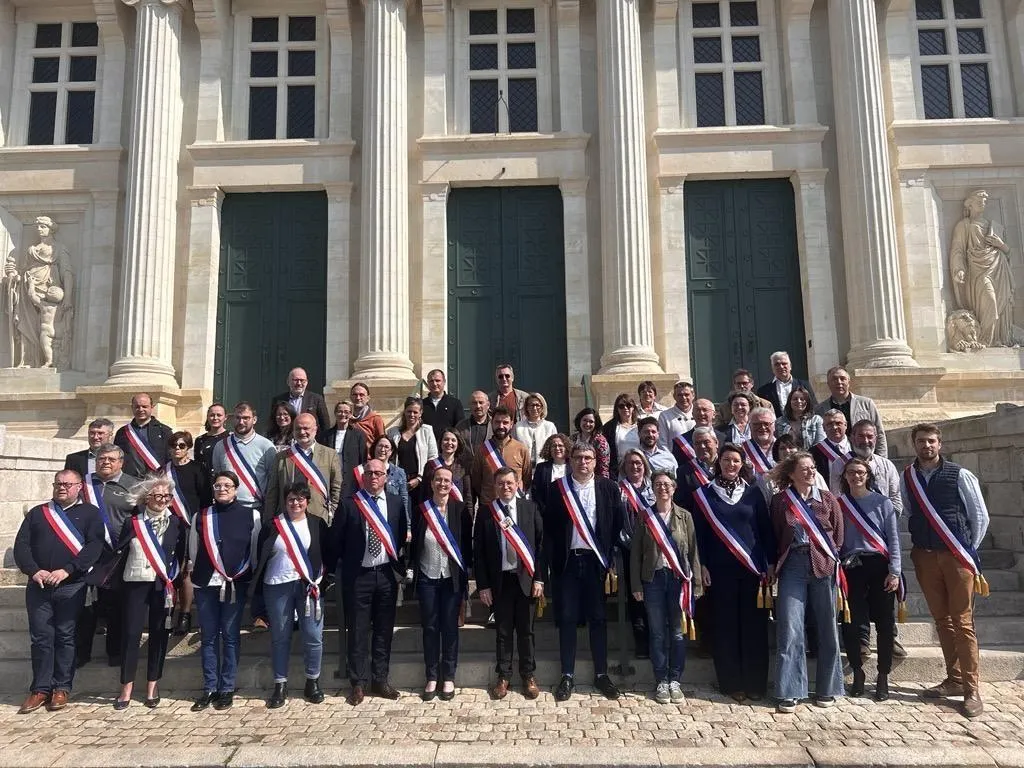 Baugé-en-Anjou, le 22 mars 2026. Le conseil municipal élu pour le mandat 2026-2032 prend la pose pour la photo de groupe devant la Maison du citoyen connecté à l’issue du conseil d’installation. © CO - Christophe Ricci