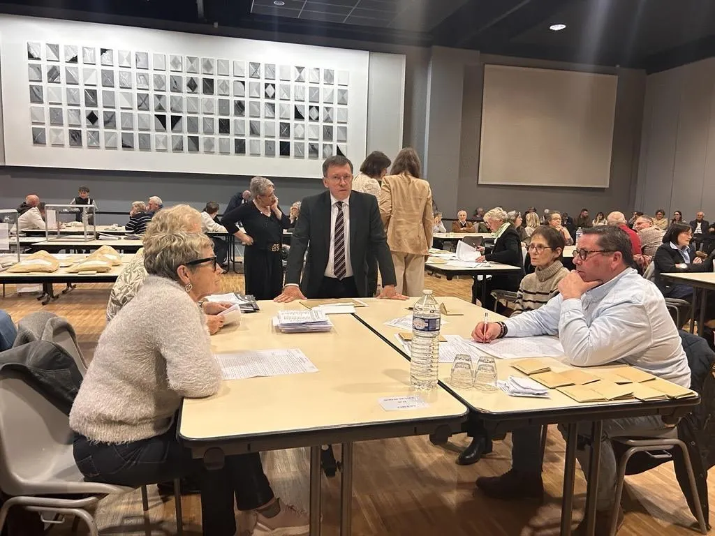 Baugé-en-Anjou, le 16 mars 2026. Le maire Philippe Chalopin discute avec des scrutateurs en attendant la fin du dépouillement. Le résultat final sera dévoilé à 21 heures. © CO - Christophe RICCI