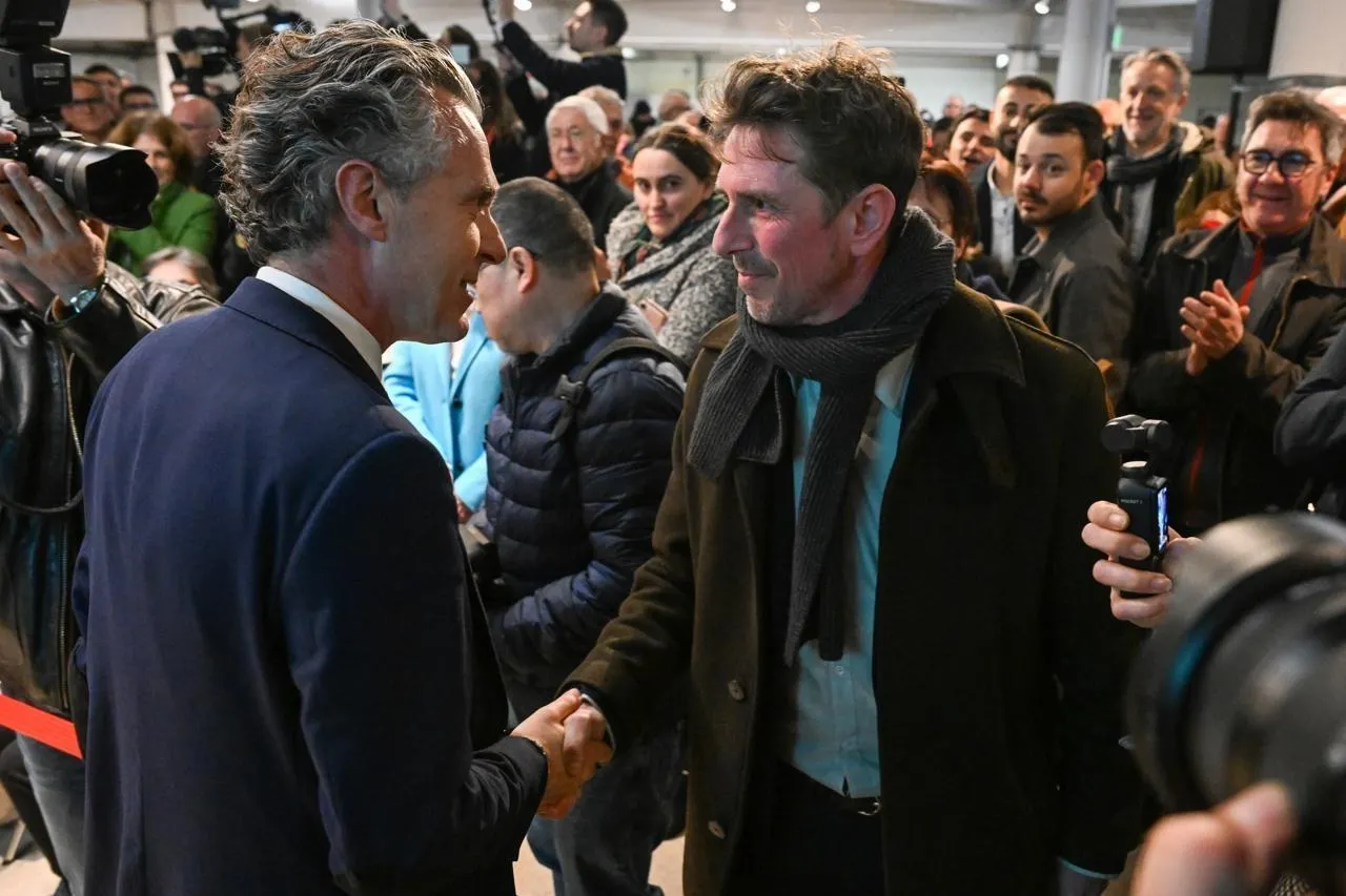 Angers, dimanche 15 mars 2026. Christophe Béchu (Horizons, Angers Pour Vous) a salué son challenger, Romain Laveau (Les Écologistes, Demain Angers) à l’issue de la proclamation des résultats, dans le parking de l’Hôtel de ville. © CO – Laurent Combet