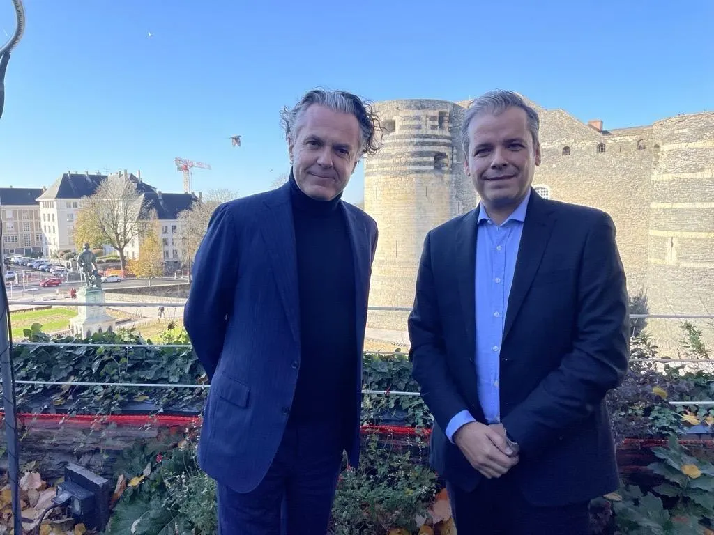 Julien Guillant (à droite) aux côtés de Christophe Béchu, candidat à la mairie d’Angers pour l’élection municipale 2026. Le conseil municipal, aussi conseiller départemental, sera son directeur de campagne. © Ouest-France