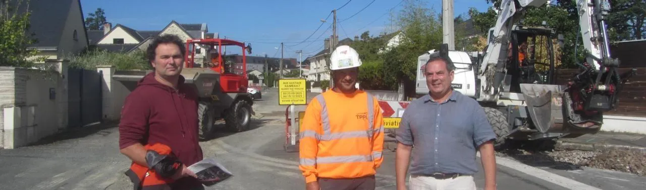 Franck Coquereau, adjoint aux mobilités ; Adrien Humeau, chef de chantier, et Jérôme Foyer, maire, rue Gustave-Raimbault. © Ouest-France