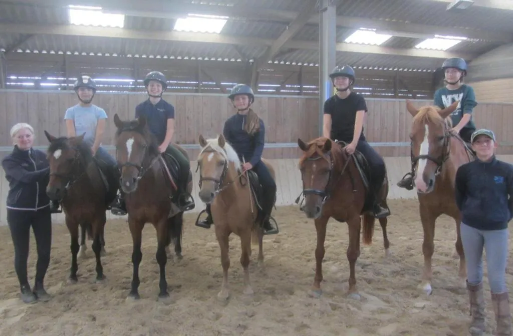 À gauche, dans le manège de 3 Rivières équitation : Bénédicte Le Guern et Gareme, Senna, Mathilde, Roxane et Agathe (à cheval). À droite, Jeanne Boret, championne de France. © Ouest-France