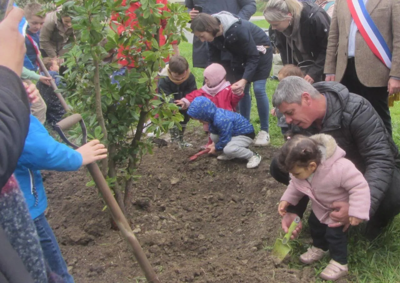 Enfants et parents finissent de planter l’arbousier, symbole des 50 enfants nés en 2024. © Ouest-France