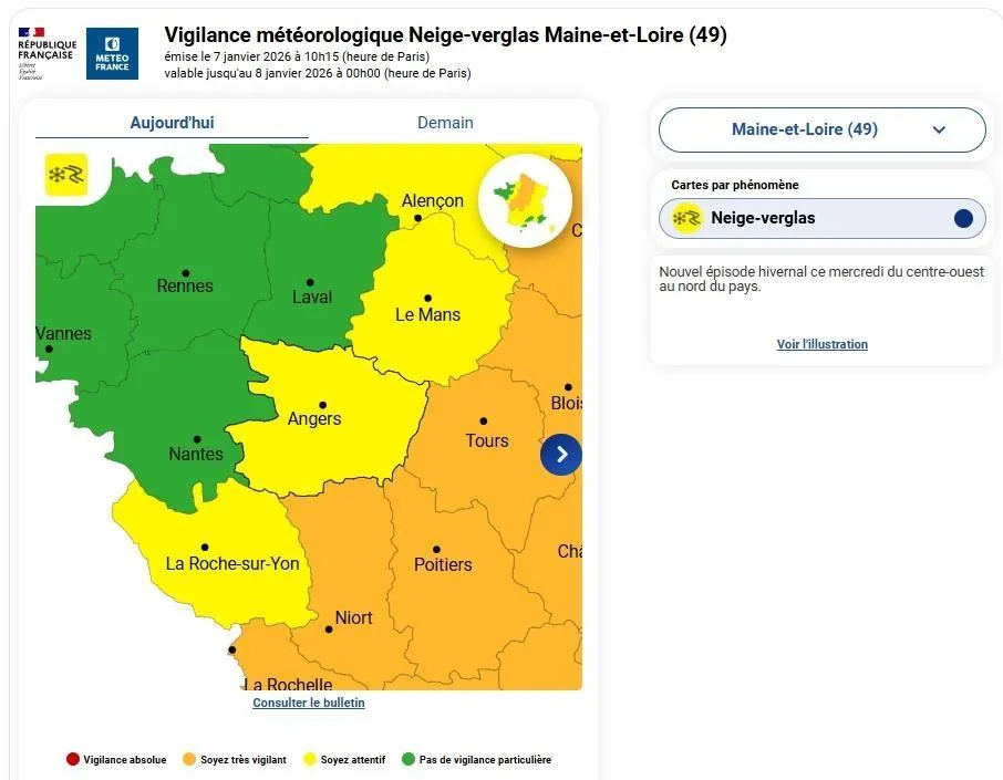 Placé en vigilance orange neige et verglas entre 4 h et 10 h ce mercredi 7 janvier 2026, le Maine-et-Loire a vu son niveau de vigilance être abaissé.