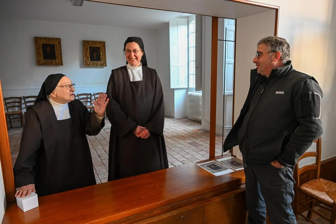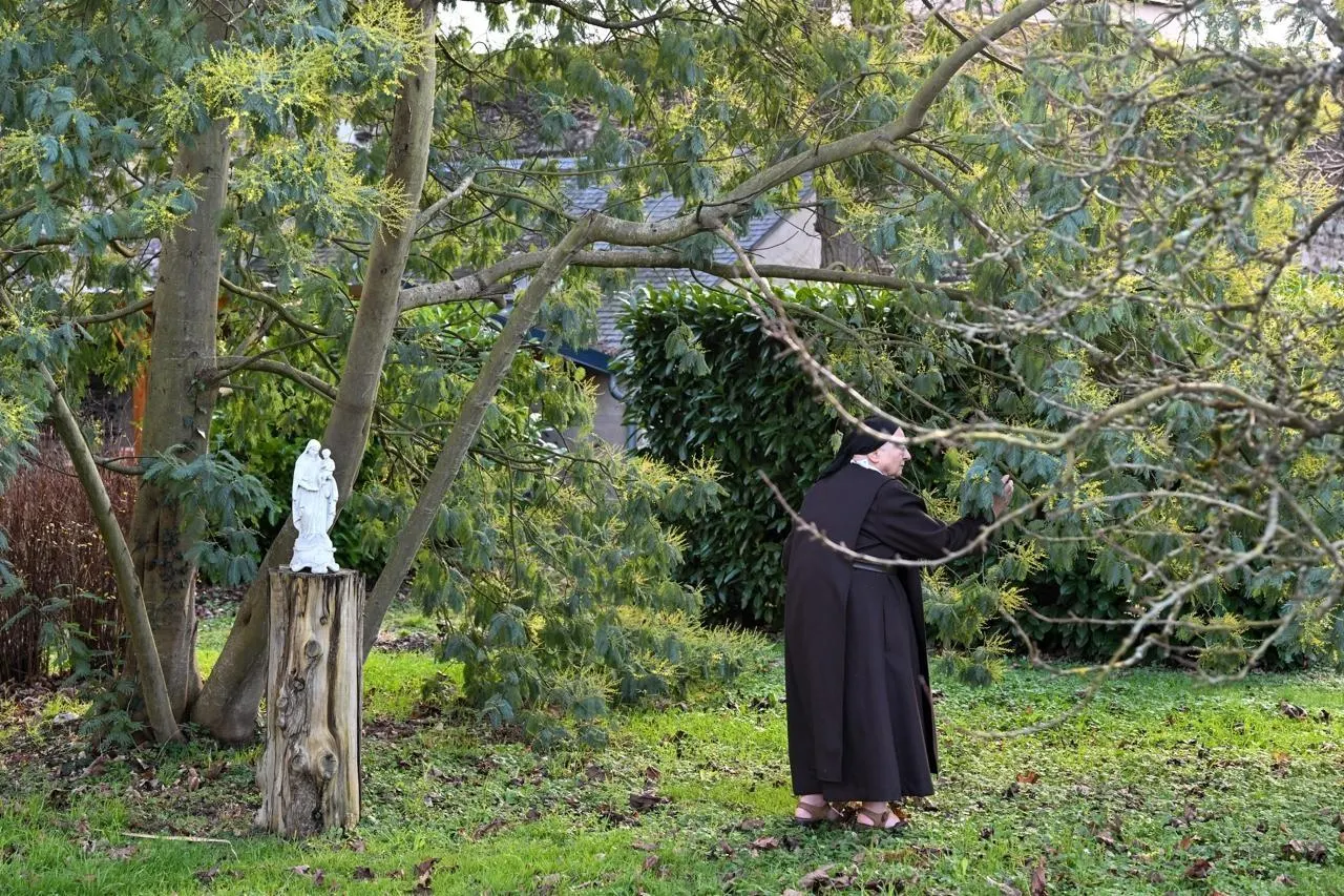 Angers, Carmel, le 20 janvier 2026. Les paysagistes Régis et Virginie Antier, la prieure SÅ“ur Charlotte-Marie et SÅ“ur Thérèse-Marguerite dans le cloître et son jardin réaménagés. © CO - Laurent COMBET