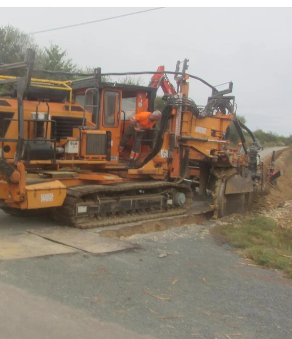 Les engins sont impressionnants : celui-ci tranche le sol, déroule le câble, dépose le sable et le filet protecteur. © Ouest-France