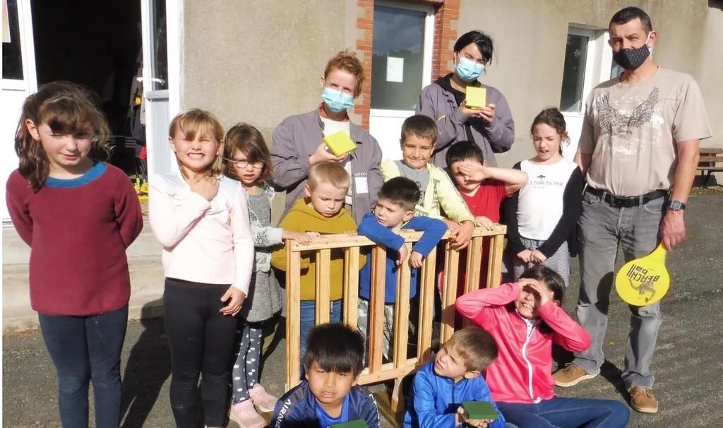 Les enfants, encadrés par Jacky, Meggy et Sandrine, sont très fiers de leur réalisation collective : un jeu « Puissance 4 » géant, en bois.
