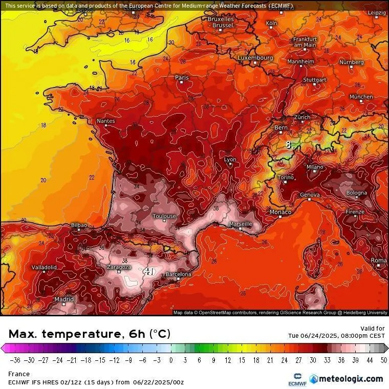 L’image ci-dessous, tirée des prévisions du modèle européen (qui fait référence en matière de prévisions à moyen terme) montre en effet que les températures maximales de mardi seront souvent largement supérieures à 30 °C dans la moitié sud et qu’elles dépasseront fréquemment 25 °C dans la moitié nord y compris dans le Grand Ouest.