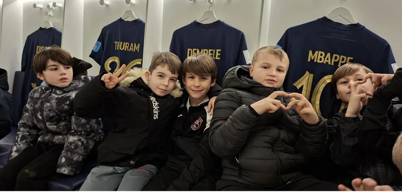 Les jeunes découvrant les places de Mbappé, Dembélé et les autres dans les vestiaires de Clairefontaine. © DR