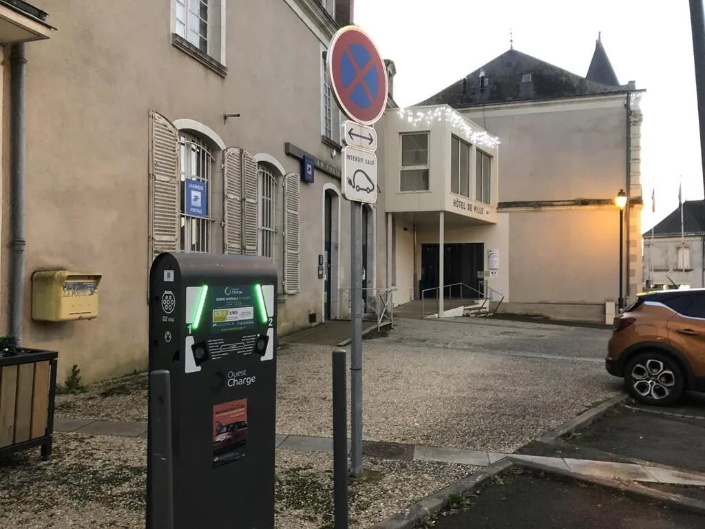 La borne de recharge électrique Ouest Charge (Siéml) de la place de l’Europe à Baugé. © CO – Christophe RICCI