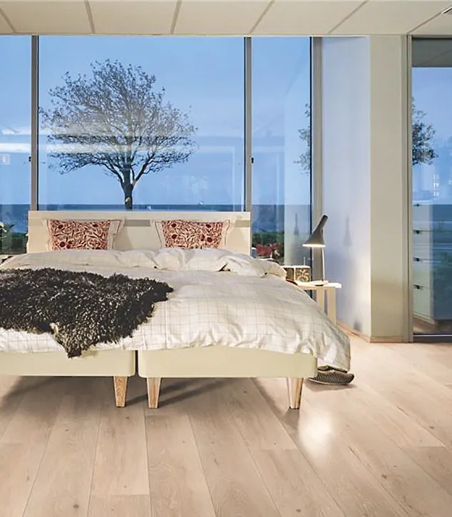 Alors que le parquet blanc vieilli avec nœuds apparents crée les bases d’un esprit bohème dans une chambre ou un salon, il peut aussi insuffler un côté bord de mer chic. Dans les maisons anciennes, il apporte clarté et luminosité aux pièces assombries par des poutres et des ouvertures étroites. Mieux vaut toutefois rehausser le ton avec des accessoires chaleureux ou colorés (tapis, rideaux, coussins, tableaux), surtout si les murs de votre pièce sont clairs. Plus de profondeur et de contraste ? Posez un papier peint panoramique fleuri, graphique, effet brique ou gravure ancienne.
