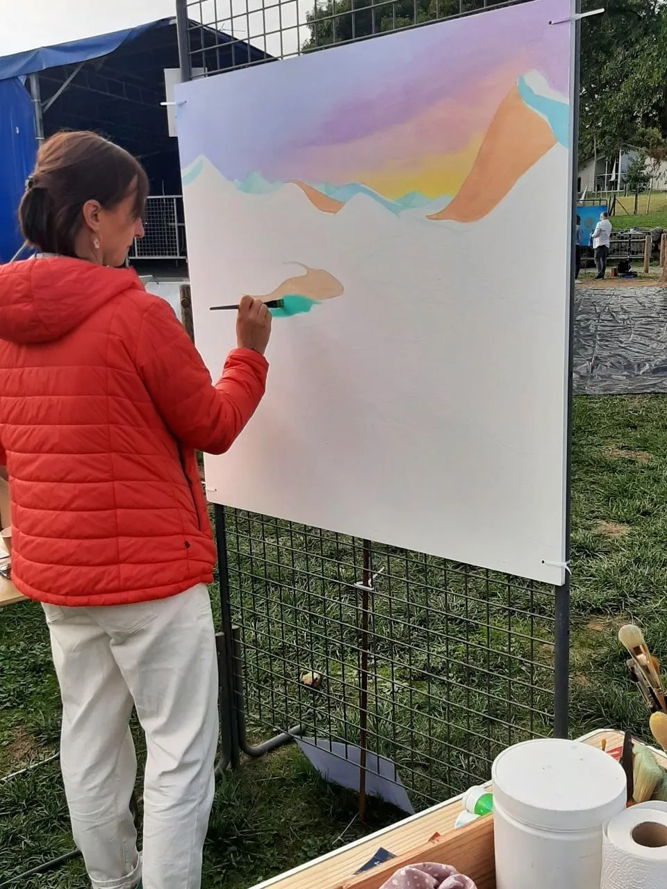 Tiphanie Fievet, ici dans la réalisation de son tableau, le jour du concours, en septembre 2025 à la fête de l’Aubance, avait obtenu le prix Créastore. Elle sera présente, dimanche 21 décembre 2025, au salon de Noël. © Archives Ouest-France