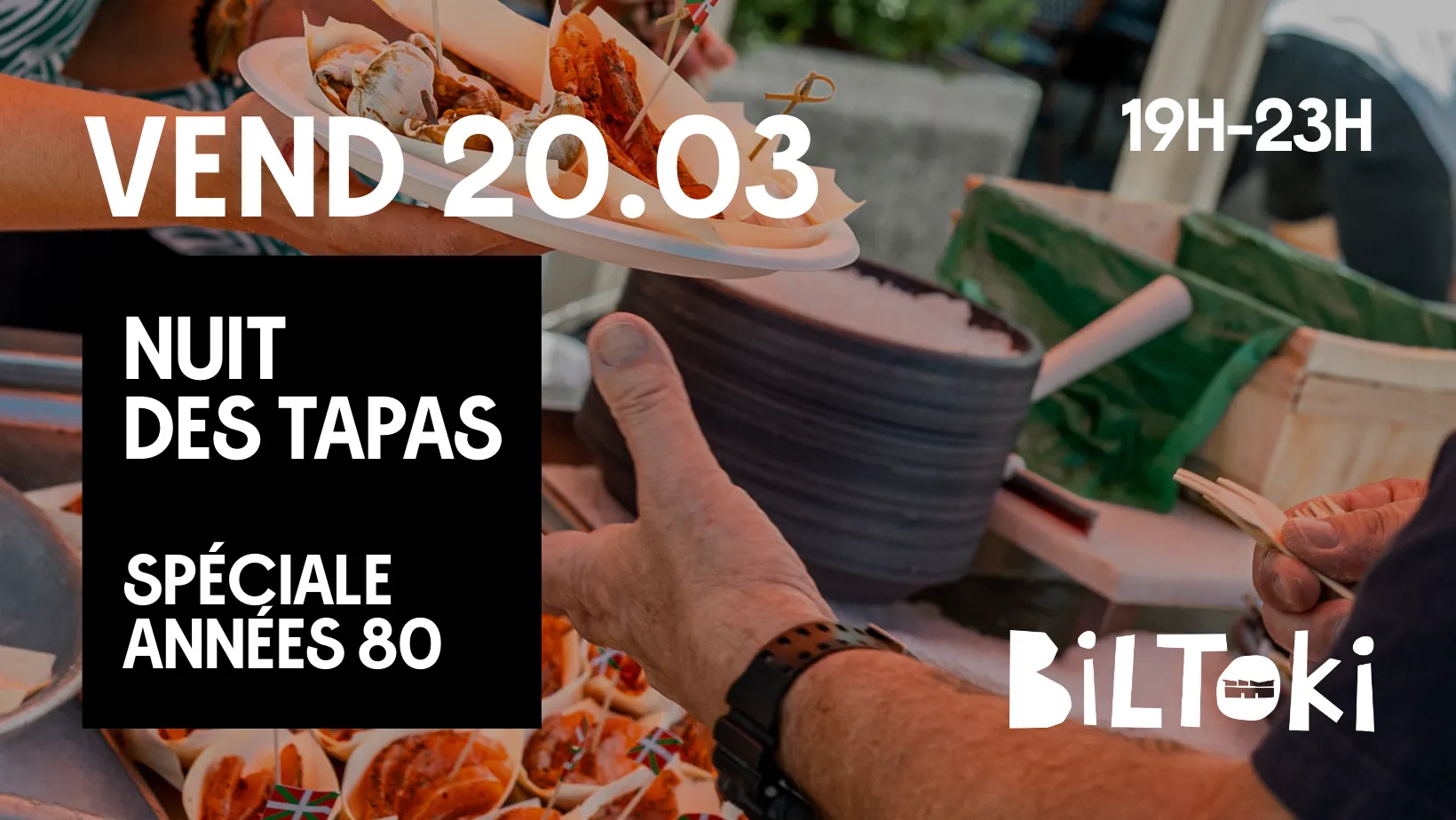 Le vendredi 20 mars, les Halles Biltoki vous invitent à la deuxième édition de La Nuit des Tapas, sur le thème des années 80. De 19h à 23h, venez vivre un moment festif et gourmand !