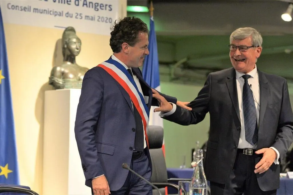 25 mai 2020 : Jean-Marc Verchère (à droite) vient de passer l’écharpe d’élu autour du maire nouvellement élu, Christophe Béchu. Aujourd’hui, en tant que premier adjoint, c’est à lui d’assumer ces fonctions. © Archives Ouest-France