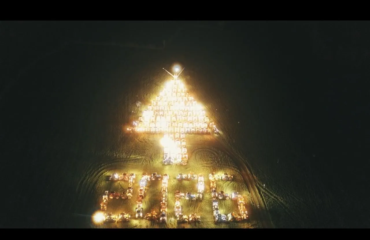 Lundi 29 décembre 2025, 200 tracteurs ont formé un immense sapin de Noël, avec l’inscription 2026 en dessous, qui s’est ensuite muée en SOS. © Fanch Parathoën/Paysan breton