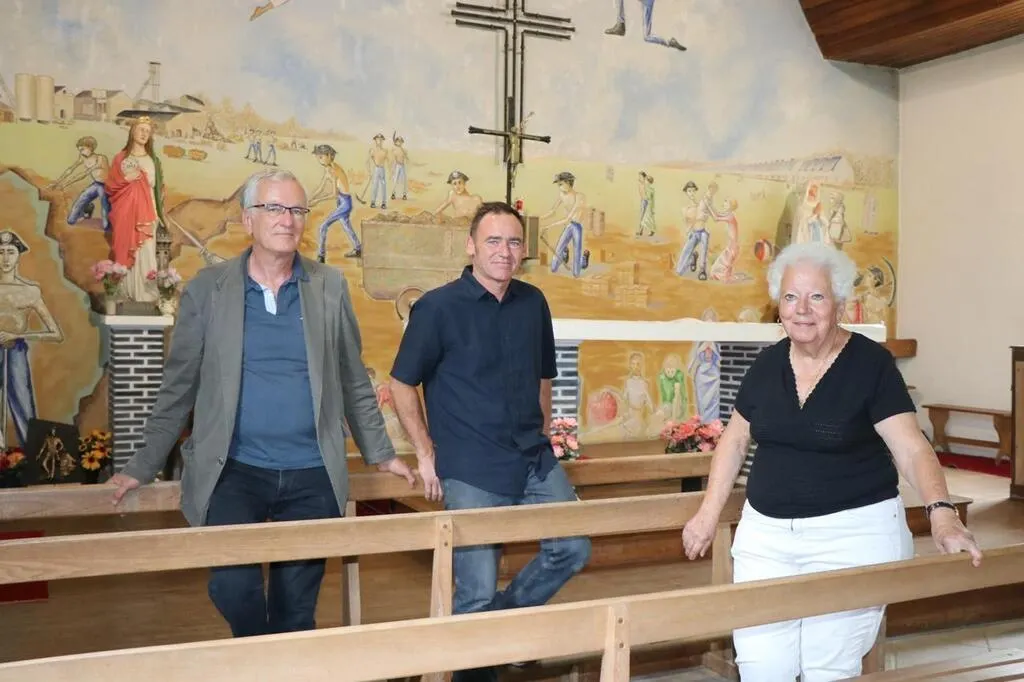 Florent Maussion, entouré de Vincent Roussier, président d’Arts et chapelles Anjou, et Maylis Thuret, vice-présidente, devant la fresque réalise par Pampa dans les années 1960. Ouest-France