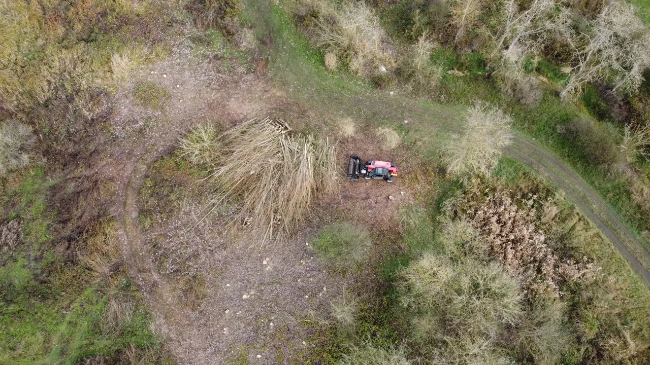 Vue aérienne de la zone de stockage des peupliers coupés à Villevêque. © Centre de formation professionnelle du Fresne