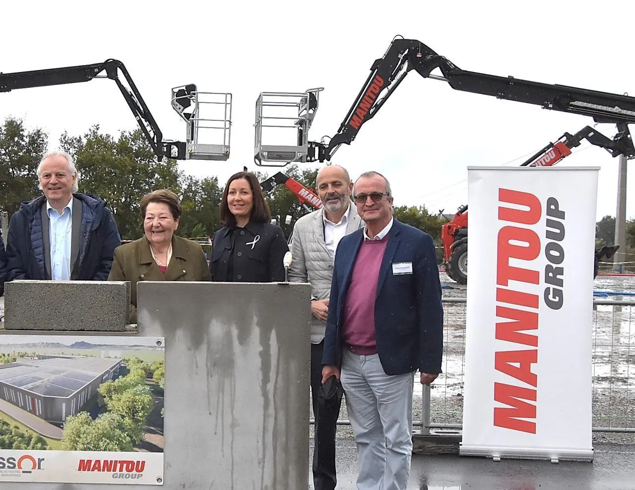 Lors de la pose de la première pierre de la future usine de mécano-soudure de Candé : Michel Denis, directeur général de Manitou ; Jacqueline Himsworth, présidente du conseil d’administration ; Florence Dabin, présidente du Conseil départemental de Maine-et-Loire ; David Poyanne, président d’Essor, et Pascal Crossouard, maire de Candé. © CO – Joël AUDOUIN