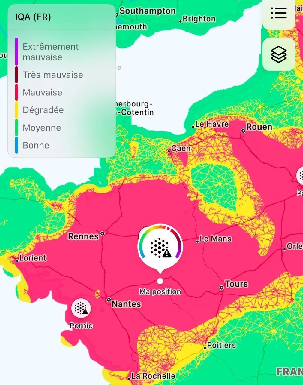 La qualité de l’air est mauvaise en Maine-et-Loire en raison de l’épisode de froid et du vent quasi nul qui favorise une pollution aux particules fines © Capture d’écran Météo Apple
