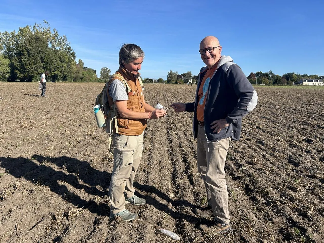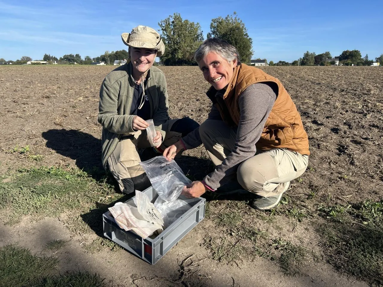 Beaufort-en-Anjou, le 7 octobre 2025. Laure Déodat (à droite sur la photo) et une étudiante en Master au Laboratoire de recherches archéologie et architectures (LARA), lors des fouilles aux Marillères. © CO – Christophe RICCI