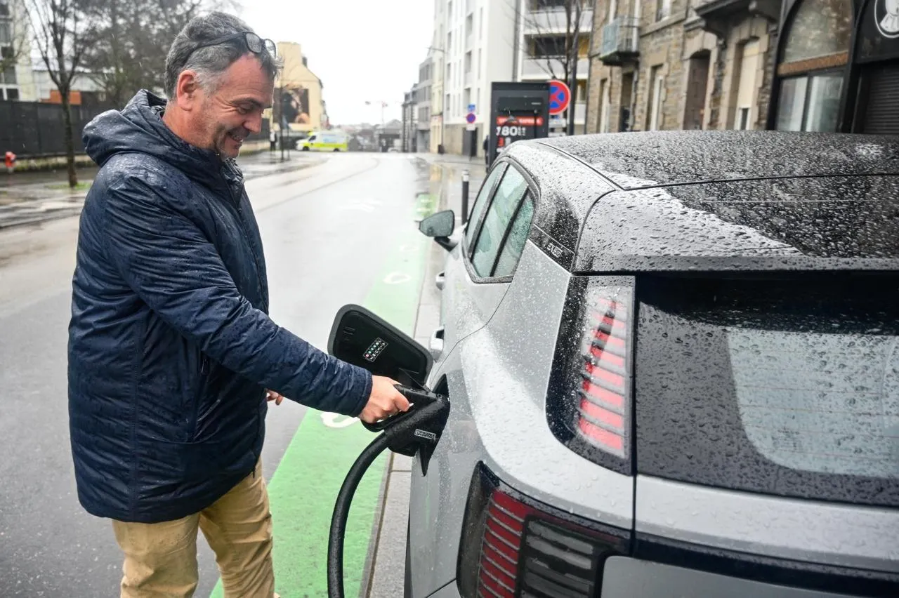 Julien Le Piver, habitant de Saint-Brieuc en possession d’une voiture électrique, est en train de recharger sa voiture électrique grâce à une borne de recharge express, sous la pluie, à Saint-Brieuc, le 15 janvier 2026. La Ville de Saint-Brieuc a déployé un réseau de bornes de recharge « Griffon Branché » avec un total de 16 stations et 48 points de charge. Elsa Rancel / Ouest-France © Elsa Rancel / Ouest-France