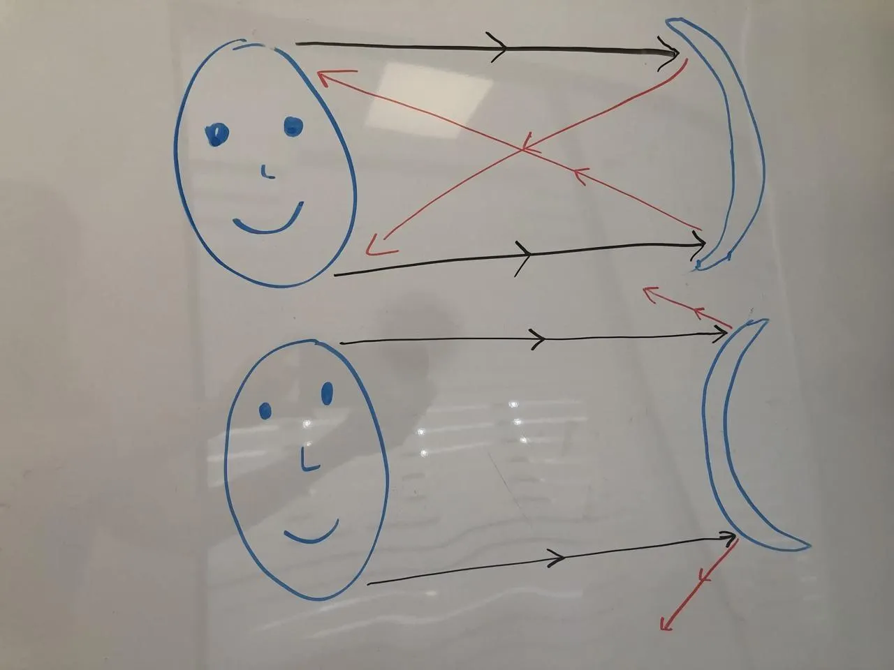 Pour expliquer ce phénomène, il convient d’abord d’expliquer comment fonctionne un miroir. Si on y voit son reflet, c’est parce que la matière renvoie les rayons de lumière vers l’œil. Si la surface est plane, les rayons renvoyés sont droits.