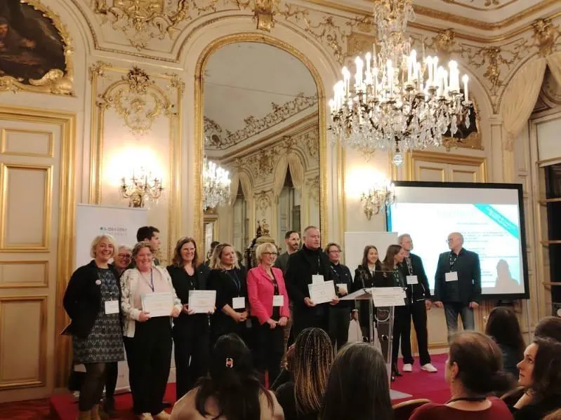 Le 21 novembre, Isabelle Raimbault, adjointe à l’action sociale, Aline Villière, chargée de mission citoyenneté et vie associative et July Delsalle, membre du Rucher citoyen (les 3 personnes à gauche sur la photo) sont allées recevoir le Prix de la participation citoyenne au palais du Luxembourg. © Ouest-France