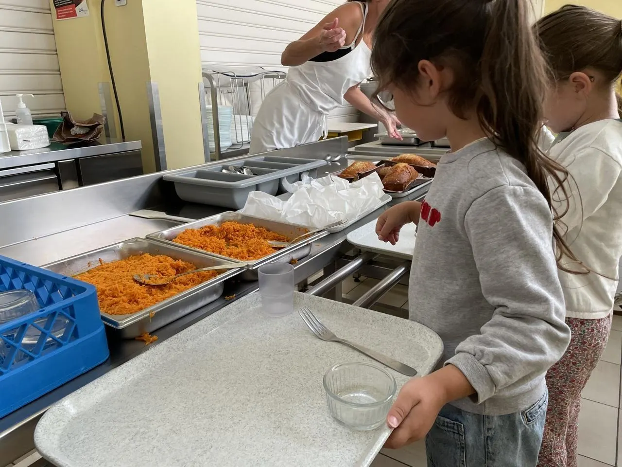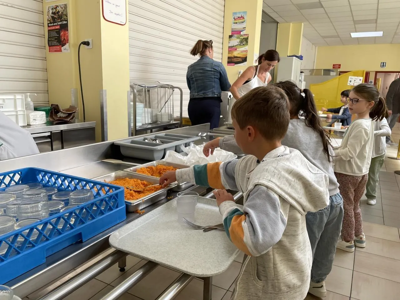 Dès midi, les élèves de Paul-Aguillé (école privée) font leur entrée pour ce premier service. Le second suivra avec les élèves des deux écoles publiques Le Chat Botté et Charles-Perrault. Au menu : carottes râpées vinaigrette, hachis parmentier végétarien (lentilles et pois chiches), camembert et gâteau au yaourt. Tout à fait convenable. Les assiettes repartent généralement vides, c’est un signe.