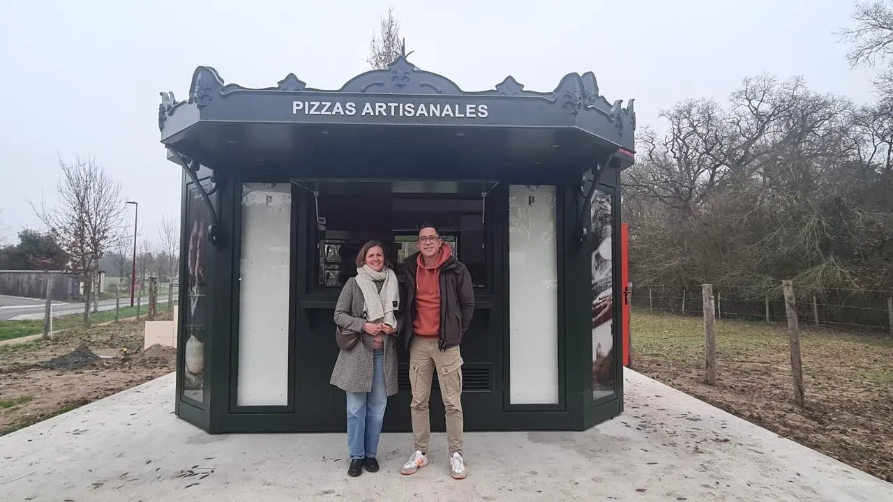 Natacha et Vincent Savoie devant leur tout nouveau kiosque à pizzas qui ouvrira le jeudi 15 janvier. © Ouest-France