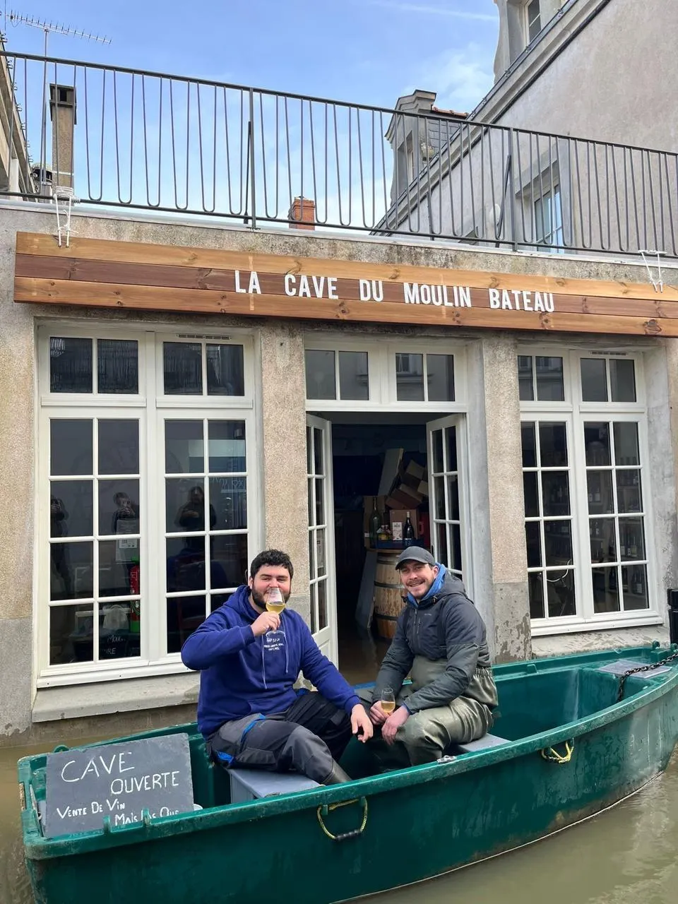 Samedi 21 février 2026, Paul et Antoine, choisissant de relativiser la situation en buvant un verre de vin dans une barque devant la cave Moulin bateau. © Moulin bateau