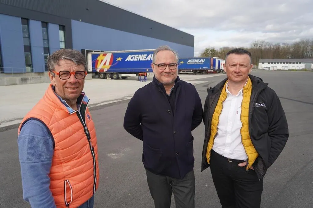 Philippe Ageneau, cogérant du groupe, Laurent Massin Le Goff, associé au projet ferroviaire et Ludovic Brin, cogérant, sur le site du transporteur Ageneau à Trélazé, près d’Angers. © Ouest-France