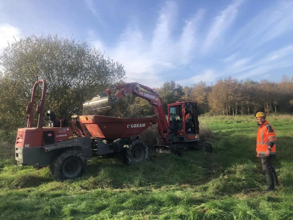 Une étudiante en génie écologique entretient une mare aux commandes d’une minipelle. © Ouest-France