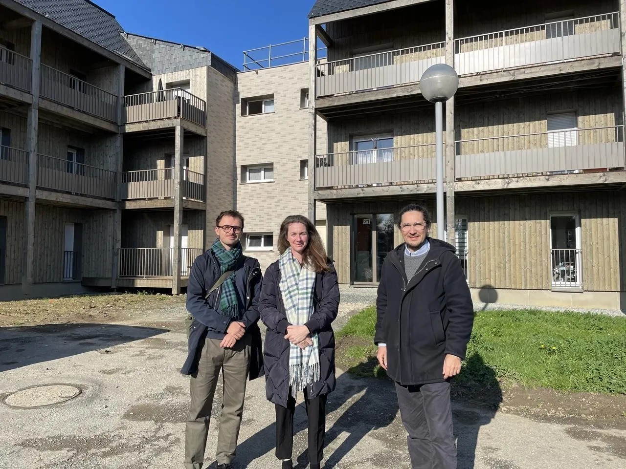 Une partie du parc locatif a déjà été réhabilité. De l’extérieur, on voit le bardage bois, le parement en brique et les balcons, derrière Maxime Coquet, Valérie Bourcier et Nicolas Doreau, chargés de différentes missions au sein de Podeliha. © CO