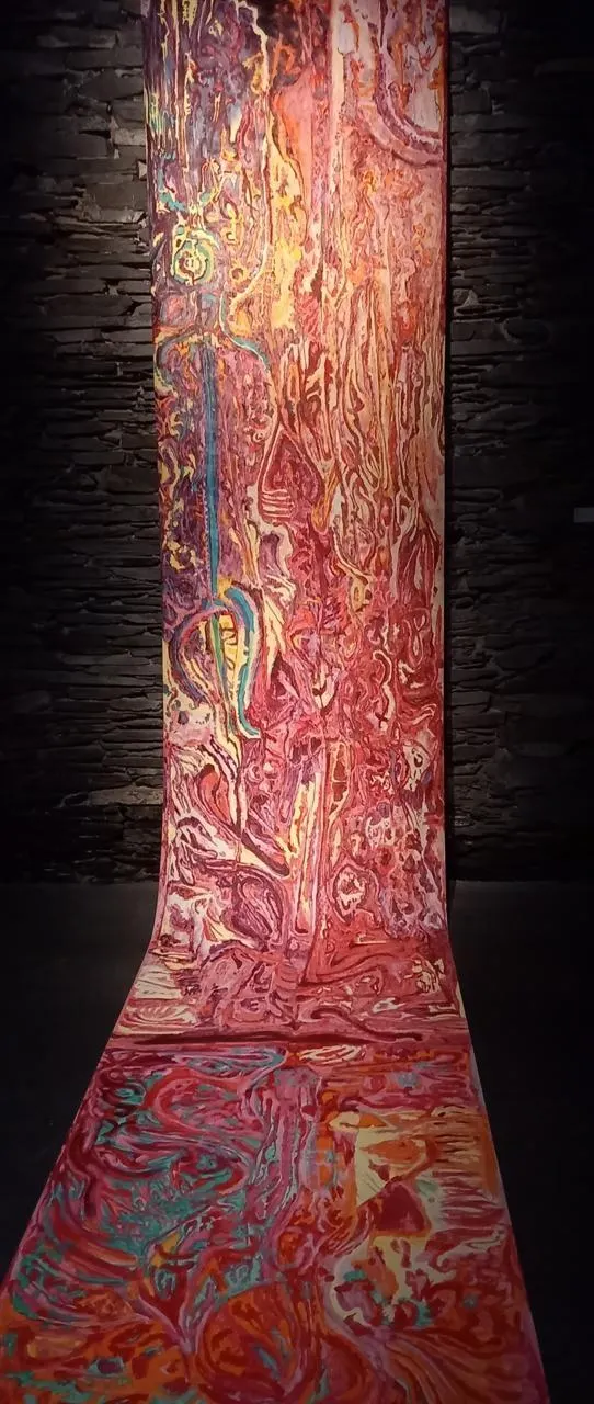 J’ai choisi de ne pas mettre mes toiles sur châssis mais de les rouler ; les cartes postales sont des extraits de journaux intimes qui répondent aux tableaux »,