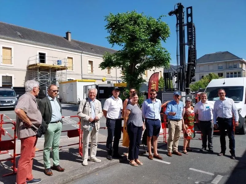 Élus, représentants du cabinet d’architecture Fardin et du programme Actee, et les responsables techniques devant les travaux de rénovation de la mairie et devant la foreuse pour la géothermie. © Ouest-France