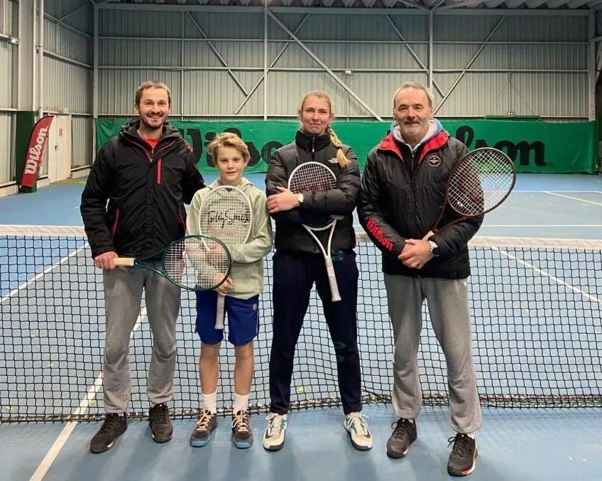 Sur les courts de la Venaiserie, Mathew avec les 3 entraîneurs du club, Clément Douay, Anaëlle Lepinay, actuellement en formation, qui a été sélectionnée aux Petits As en 2 015, et Hugues Guerraud. © Ouest-France