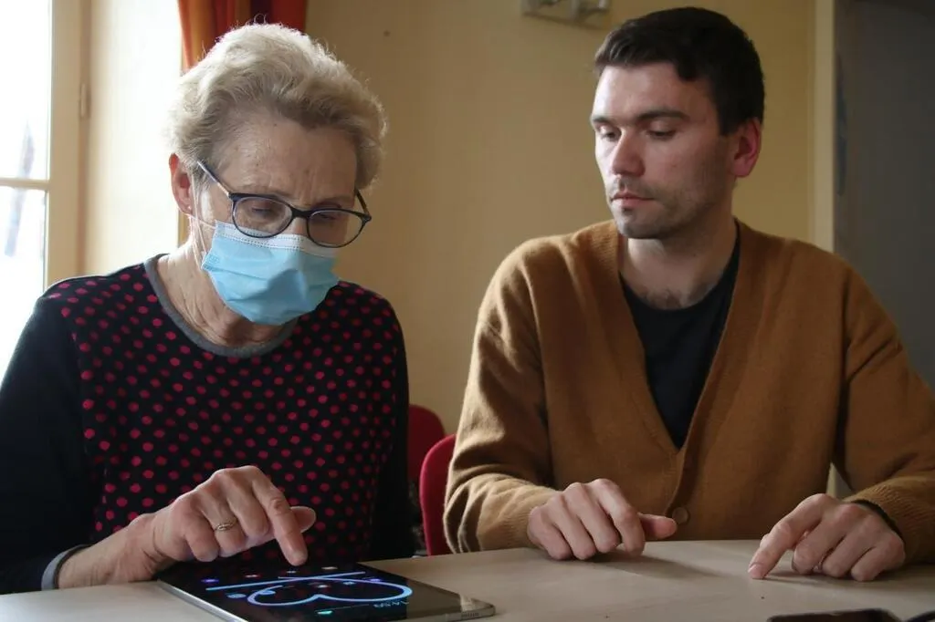 Challain-la-Potherie, mercredi 6 avril. Josette n’a jamais touché à l’informatique. Vincent Le Parc, conseiller numérique, l’a initiée à la tablette. © CO