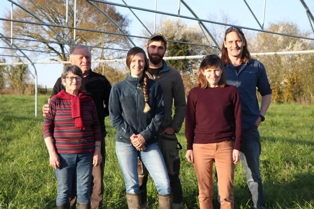 Les trois générations réunies sous la serre destinée au maraîchage : de gauche à droite, les grands-parents Janine et Henri Leray, Sarah Pétreault et son compagnon Killian Conesa, et les parents Nathalie et David Pétreault. © Ouest-France