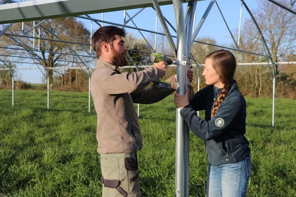 Killian Conesa et Sarah Pétreault passent de nombreuses heures à monter la serre. Bientôt, ils la bâcheront. Ouest-France