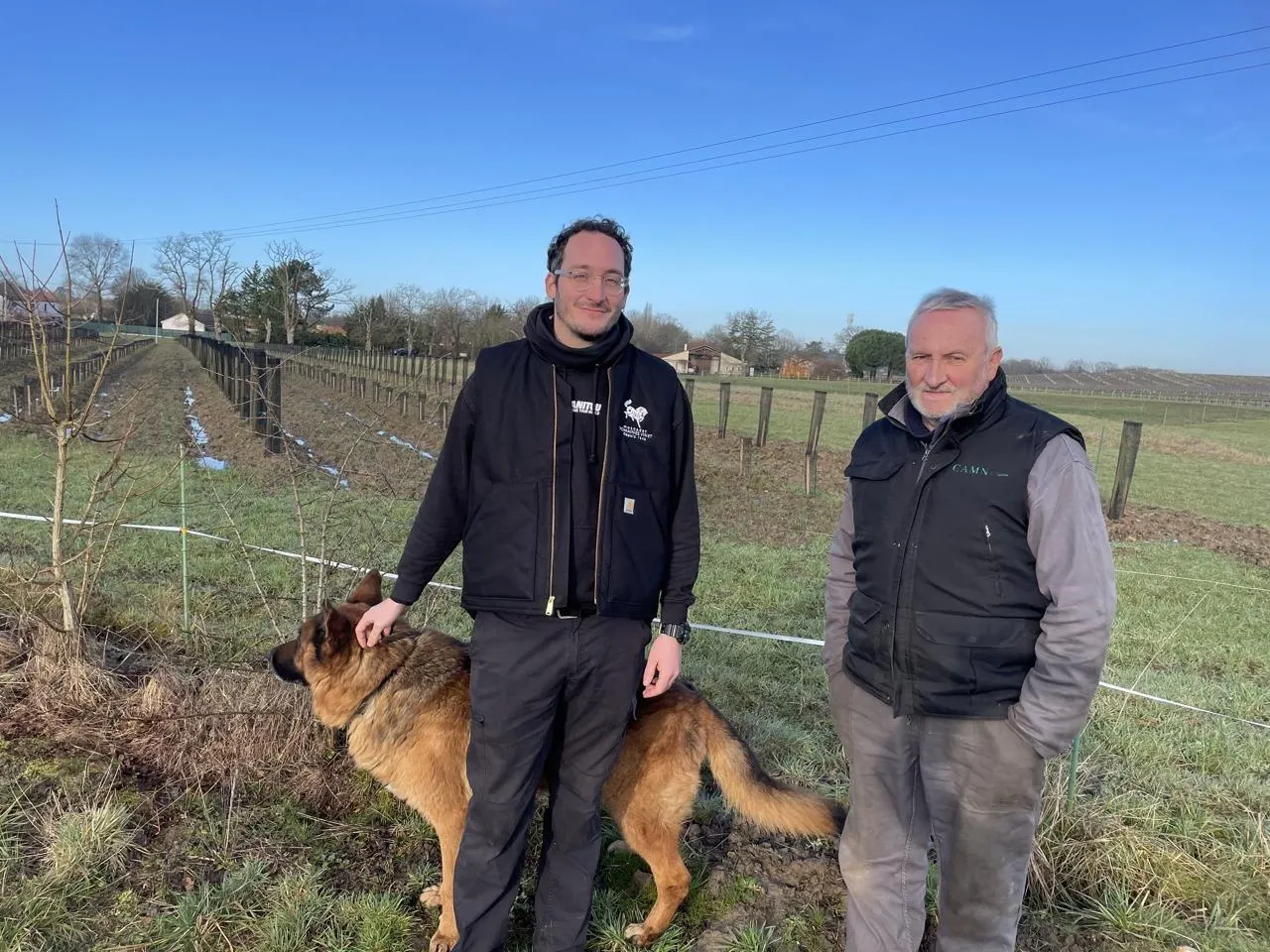 Mathieu et Gérard Vinet, vignerons à La Haie-Fouassière (Loire-Atlantique), devant la nouvelle plantation de bosquet. Au fond, derrière eux, la cave du Domaine Vinet. © Ouest-France