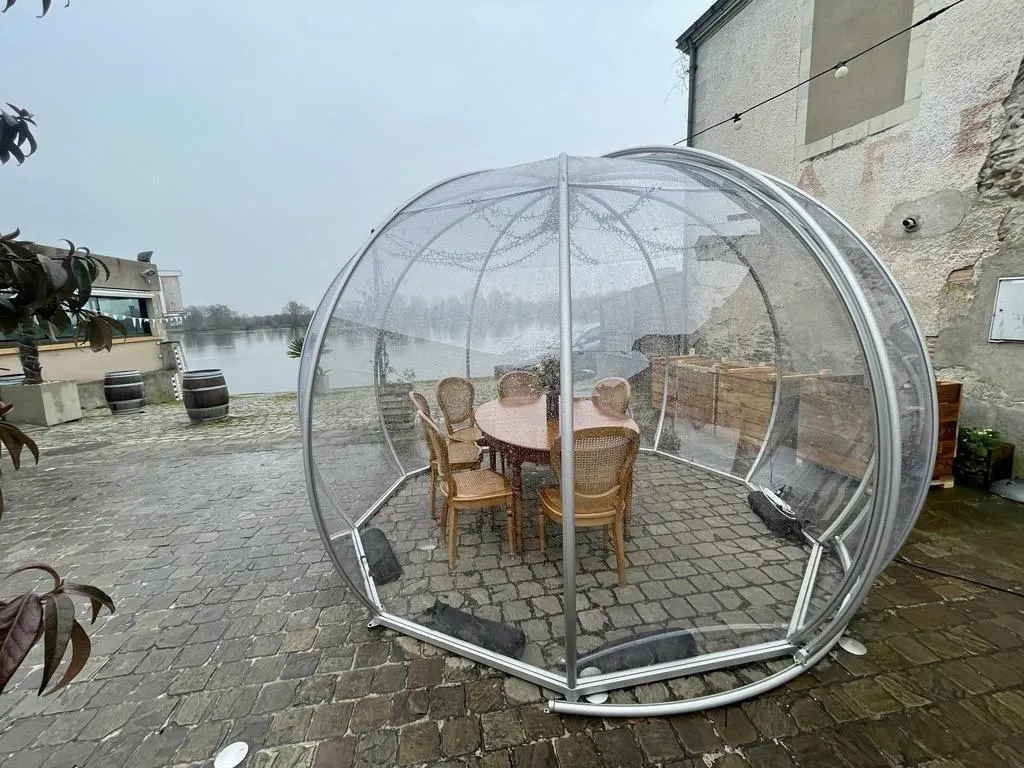 Une bulle transparente a été installée sur la terrasse du restaurant La Bafouille, place Ruzebouc, dans le village de La Pointe, à Bouchemaine, près d’Angers.