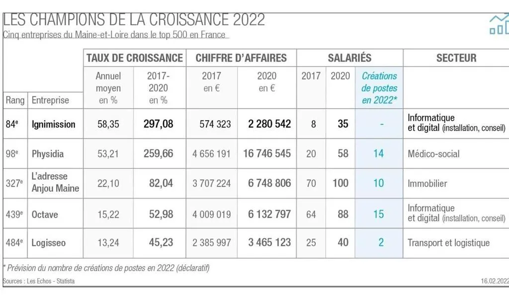 Le « Top 500 des champions de la croissance » fait la liste des entreprises qui affichent des performances exceptionnelles. Cinq entreprises du Maine-et-Loire en font partie cette année.