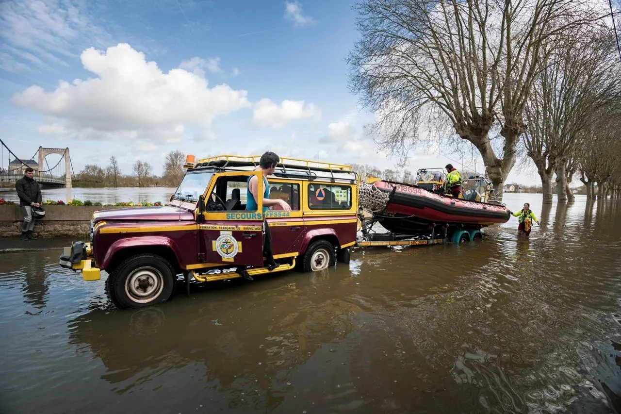 Le grand bateau pneumatique des secouristes glisse doucement sur le quai immergé. Difficile de savoir où plonger l’hélice quand on ne sait pas ce qui se cache sous la surface. Borne en pierre parapet, souche, l’eau boueuse ne permet pas de se faire une idée précise. Les trois jeunes bénévoles prennent le parti de laisser l’embarcation rejoindre tranquillement le lit du fleuve où le courant très puissant les embarque aussitôt. Ils sont arrivés de Nantes vers midi pour prêter main-forte aux pompiers qui ont déjà mis à l’eau deux canots. Résister aux courants et tourbillons qui agitent le fleuve nécessitait des moteurs puissants.