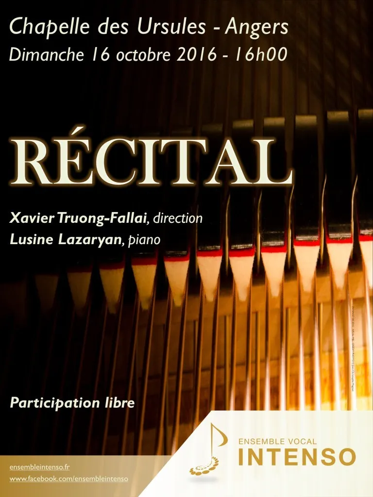 Récital dimanche 16 octobre 2016 à 16 heures à la chapelle des Ursules à Angers. Extraits d'opéras et opérettes par l'Ensemble INTENSO... |