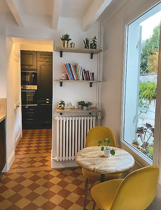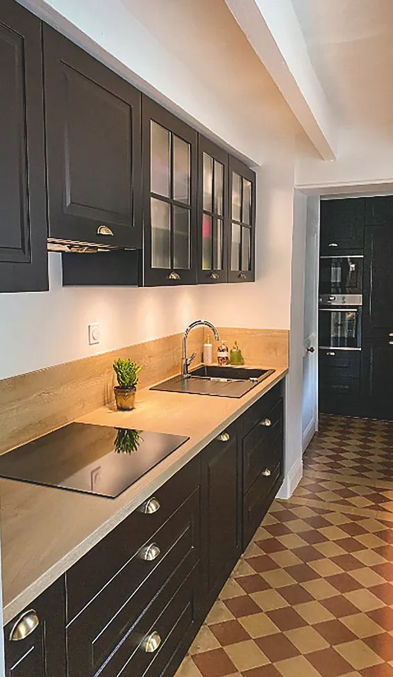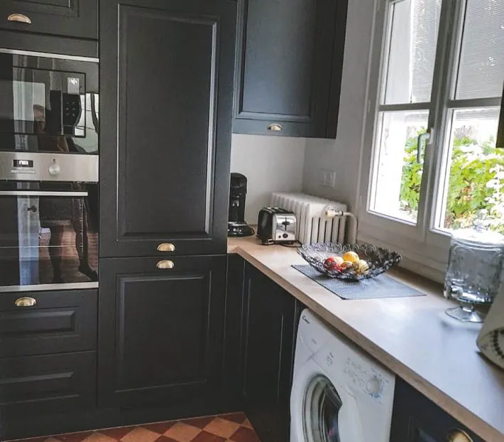 Le premier défi était de s’accommoder de la pièce en deux parties : l’une dédiée à la préparation des repas, l’autre au stockage. Malgré cette configuration relativement atypique, il fallait créer une unité et une circulation facile entre ces deux espaces. Le projet a aussi évolué au fil du temps : les portes avaient d’abord été imaginées dans une teinte blanc vert pour éclaircir et rappeler l’aspect nature. Le noir a pourtant été retenu au final pour son élégance. Il répondait aussi au sol tomettes d’époque. Pour alléger la partie haute, la hotte a été dissimulée et du verre fumé a été ajouté sur certains panneaux. Il restait encore des défis à relever : le plan de travail a été découpé sur mesure, avec précision, car aucun mur n’était droit. Il a même fallu effectuer une découpe pour le radiateur déjà présent. À proximité de l’autre radiateur, des étagères décoratives ont été posées. Tous ces travaux ont permis d’atteindre le but des propriétaires : redonner de l’éclat et de la valeur à la cuisine, pour que son aspect daté soit enfin au même niveau de qualité que le reste de la maison.