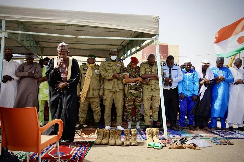Des officiers de l’armée nigérienne se mêlent à la prière collective organisée devant la base aérienne de Niamey le 22 décembre, quelques heures après le départ des derniers soldats français. © Sophie Douce /Ouest-France