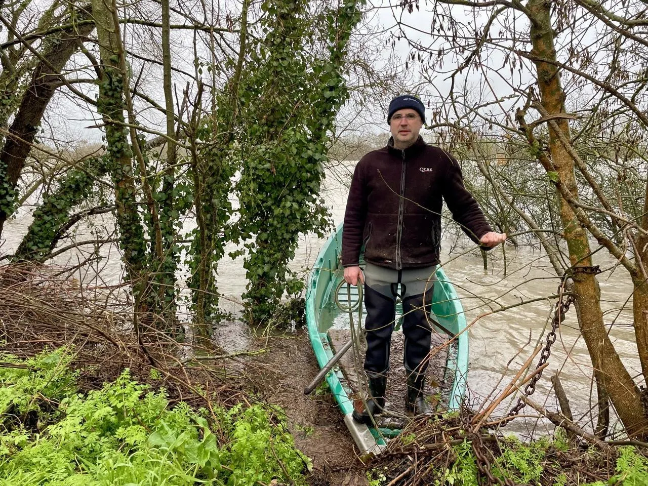 Saint-Florent-le-Vieil, 15 février 2026. Franck Richard, habitant l’île Batailleuse, prépare sa barque pour se déplacer en raison de la vigilance « crues » en cours. © CO - Lucas Rojouan