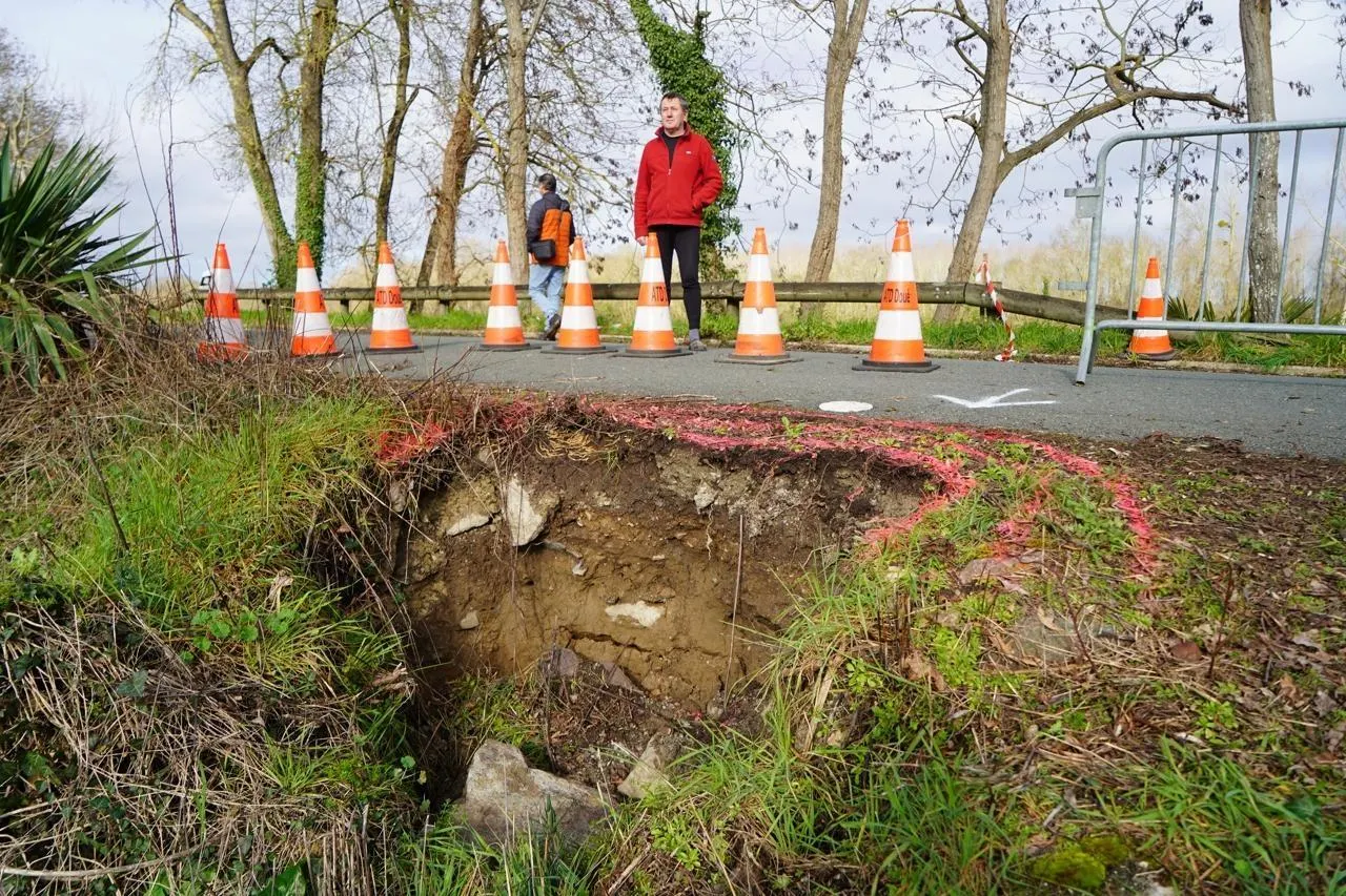 Un effondrement de la levée de la Loire aux Ponts-de-Cé, samedi, a provoqué la fermeture de la route à la circulation et l’appel à évacuer les lieux pour la population. © Ouest-France