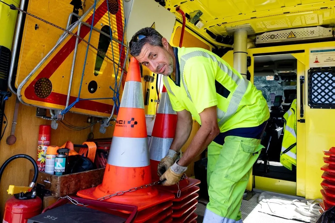 Parfois arrêté à moins d’un mètre de véhicules lancés à 130 km/h, Lionel Ruchon, patrouilleur depuis une vingtaine d’années, parcourt quotidiennement le réseau autoroutier Vinci sur l’A87 en Maine-et-Loire pour sécuriser les véhicules sur le bas-côté.